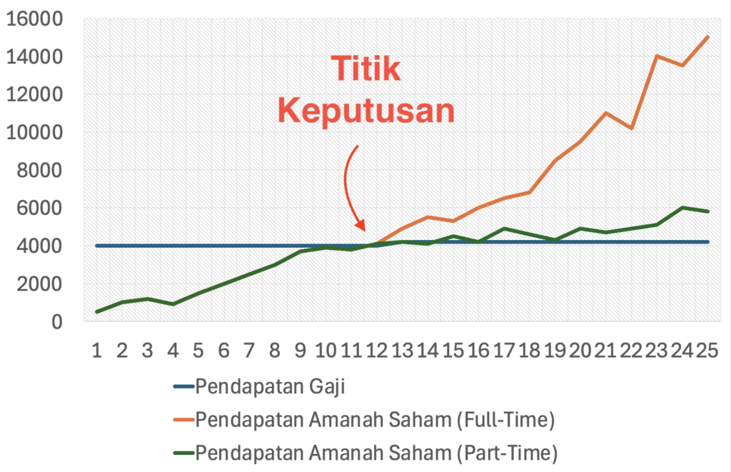 Kami ada sediakan roadmap bagi setiap ejen berdaftar untuk bergerak dari Dual Income (Gaji + Part Time) kearah Solid Income (Full-time Amanah Saham) dimana setiap ejen akan melalui satu fasa Turning Point (Titik Keputusan) untuk bergerak dari part-time ke full-time.